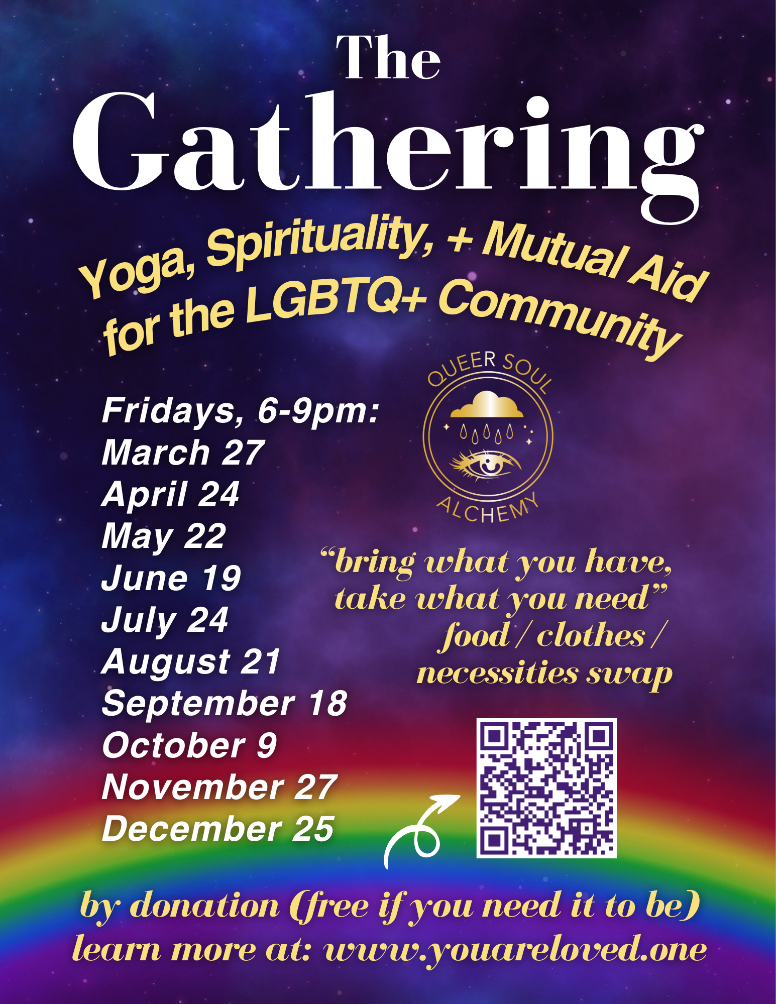 The Gathering: Yoga, Spirituality, and Mutual Aid for the LGBTQ+ Community (by donation!) Friday, March 27, 2026 6:00 PM Friday, December 25, 2026 9:00 PM Google Calendar ICS More Details + Register Here