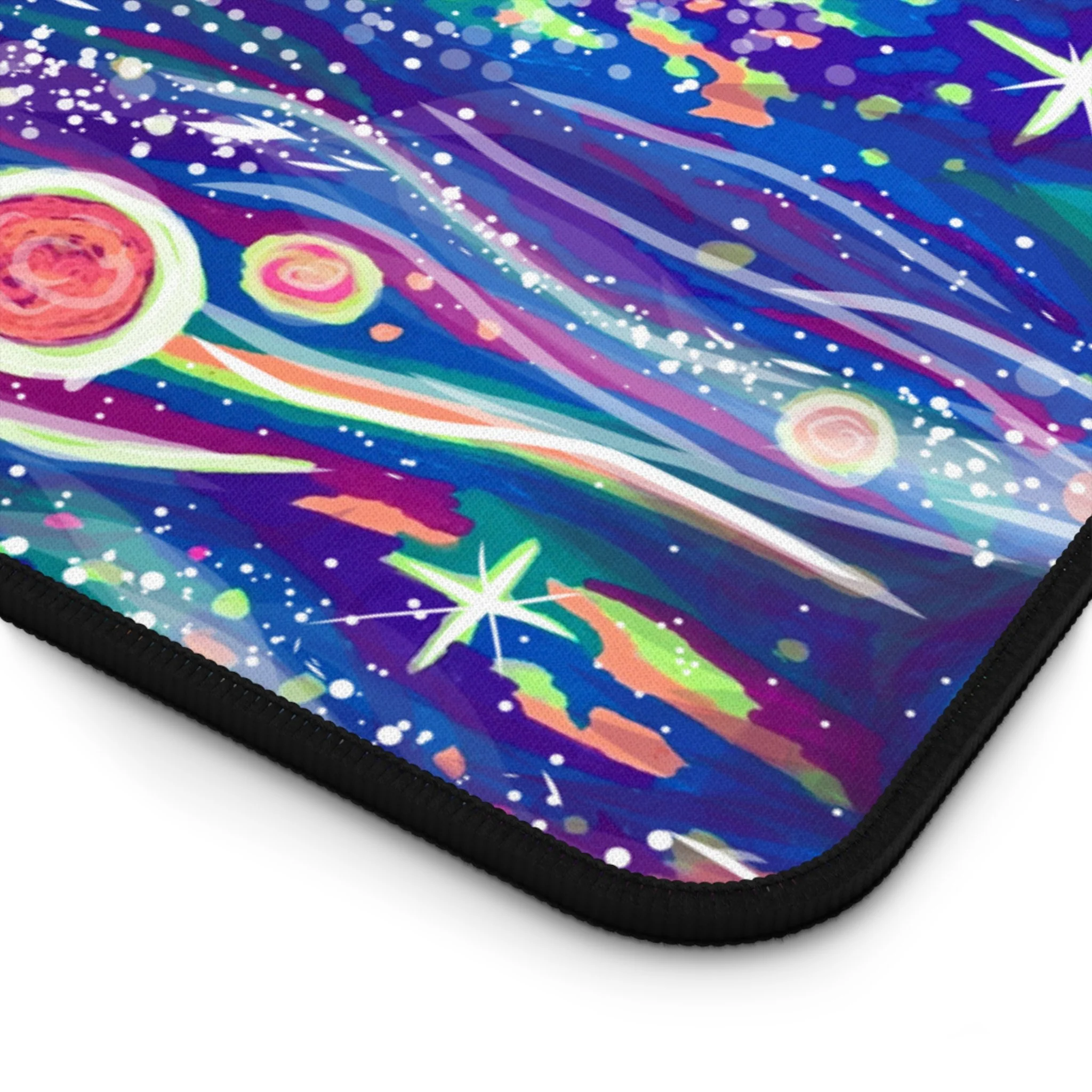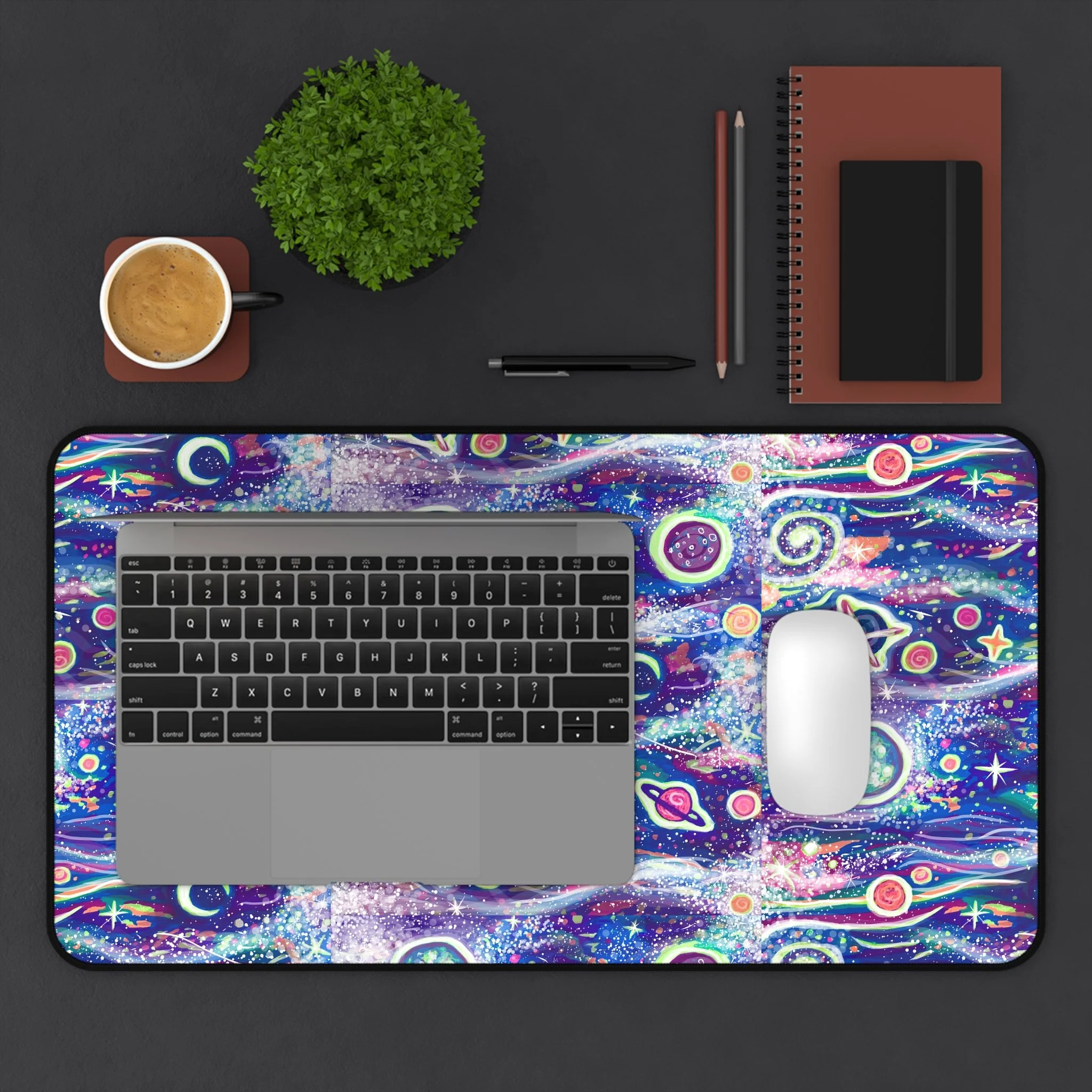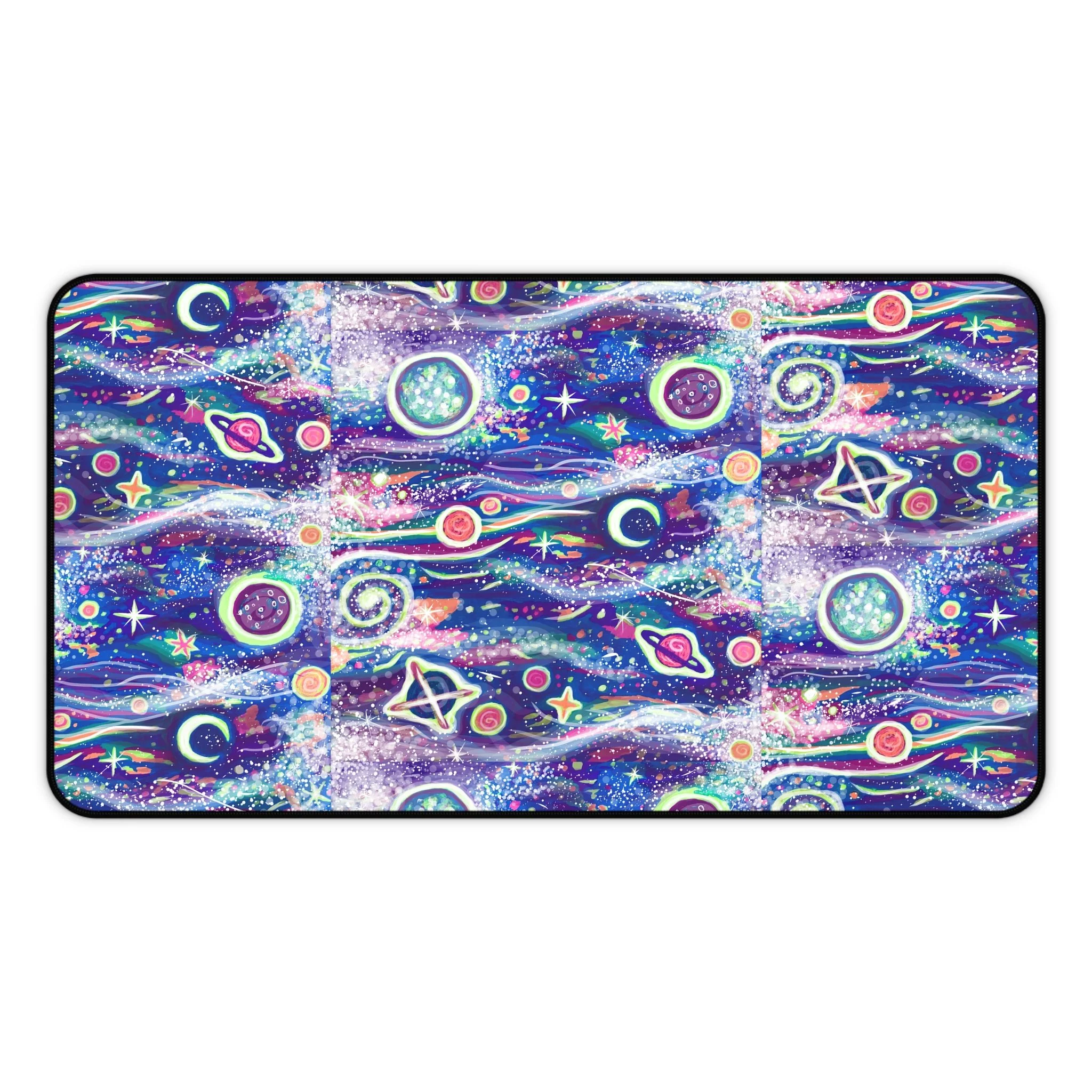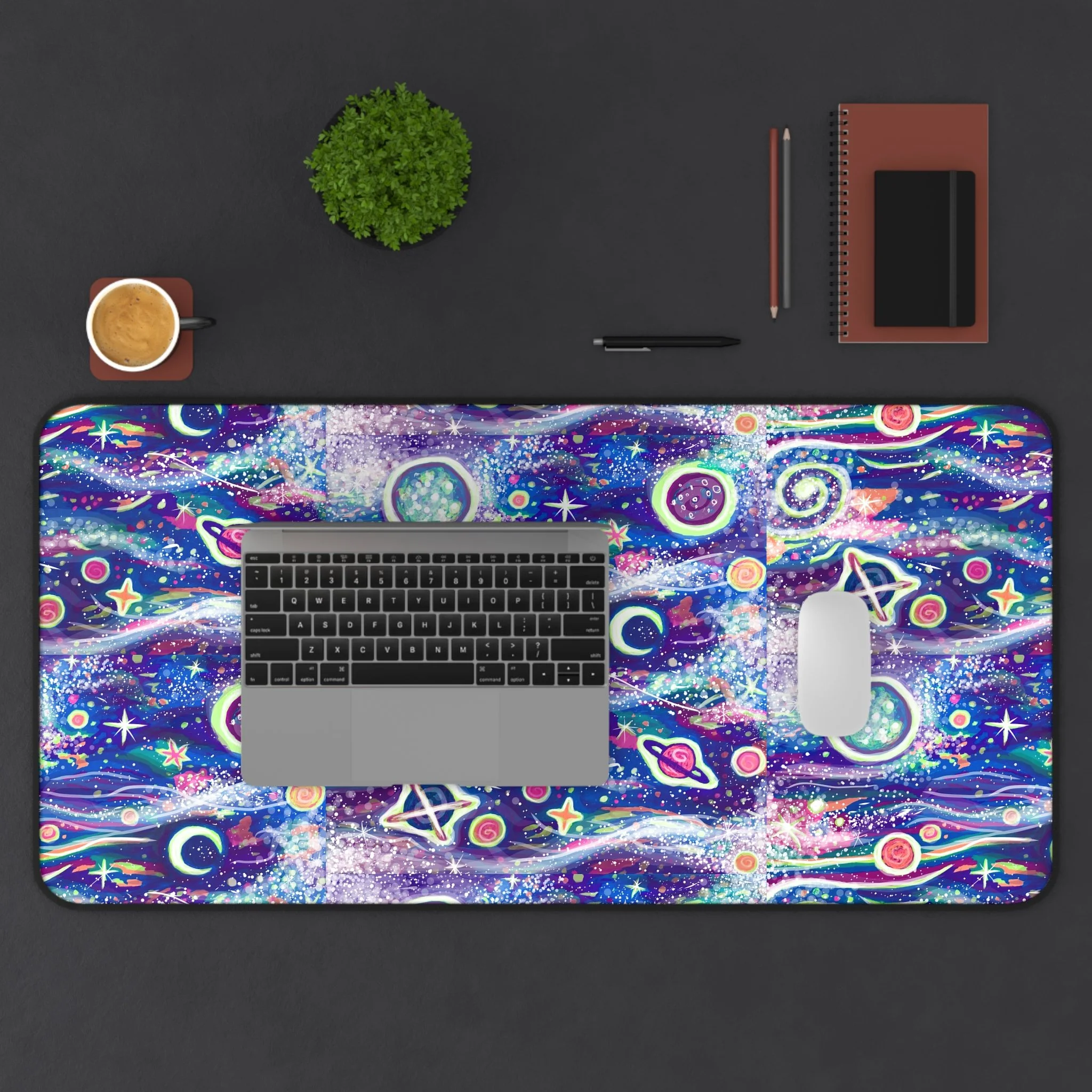 This galaxy print desk mat is perfect for that touch of style at work or in your home office. Made of 3mm thick neoprene material, it has an anti-slip backing and a hemmed edge for durability and stability. Available in two sizes: 12” × 22” & 32" × 16".